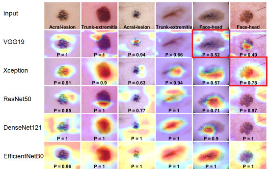 In Figure 8, we present two examples for each anatomic site with their corresponding heatmaps for pretrained architectures. Regions on which the network focuses are marked in bright colors superimposed on the input image. From these images, we can draw several conclusions. Firstly, we observe that the proposed architectures do not always concentrate on the region of interest. For VGG19 and ResNet50, the classification is mostly based on the surrounding area resulting in a low Softmax score (p value) within the range of 0.4–0.7, while DenseNet121 and EfficientNetB0 calculated the final score based on the skin lesion area and achieved the highest p value close to one. Furthermore, EfficientNetB0, which achieves the best results, tends to take very large areas into consideration instead of focusing on a single area.