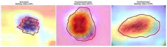 where H is the heatmap image, and S is the binary segmentation mask. Based on the proposed overlap coefficient, we can observe (see Figure 9) and confirm that the classification has been mostly performed based on the skin lesion area for skin lesions originating in trunk/extremities and face, while the acral lesions have been classified based on the surroundings.