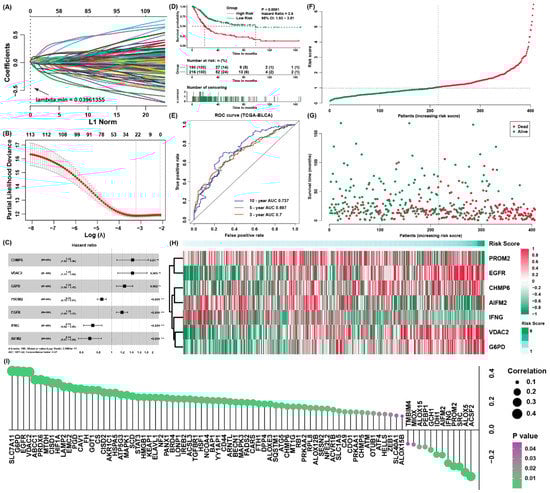 Construction of a ferroptosis regulator signature of BLCA. (A,B) The LASSO model and the LASSO coefficient profiles are presented; (C) independently prognostic parameters of the ferroptosis regulator signature; (D) the survival curves of the low-risk and high-risk group; (E) the ROC curves for overall outcomes of three, five and ten years; (F) the risk score distribution in the patients with BLCA from TCGA; (G) the vital status of patients from different group of risk scores; (H) the heatmap for the expression of genes in the signature; (I) the possible correlation between the expression of ferroptosis regulators and the risk score.
