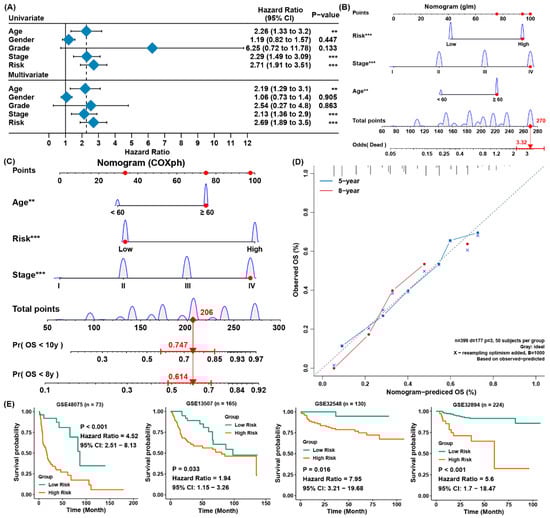 Establishing a predictive nomogram and external verification. (A) Univariate and multivariate Cox analysis of clinical parameters and risk scores with outcome of overall survival of the patients with BLCA from TCGA; (B) the nomogram to predict the rates of death of patients with BLCA; (C) the nomogram to predict overall survival outcomes of BLCA patients for five and ten years; (D) the calibration curve to evaluate the accuracy of the nomogram constructed based on gene signature; (E) verification of the ferroptosis-associated gene signature in four external cohorts from GEO. ** p< 0.01, *** p < 0.001.