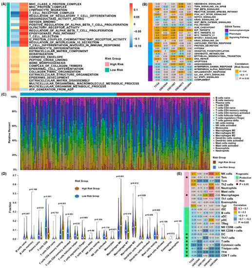 Functional characteristics of the ferroptosis regulator signature. (A) The result of GSEA showed different enriched gene sets between low-risk and high -risk group; (B) the correlation coefficient between the scores of GSVA and the risk scores in five datasets; (C) the relative infiltration percentage of 22 immune cells of each patient from TCGA through CIBERSORT; (D) the violin plot showing the relative infiltration level of immune cells based on the low-risk and high-risk group; (E) correlation analysis between the abundance of the immune cell enrichment score and the risk score in five independent datasets.