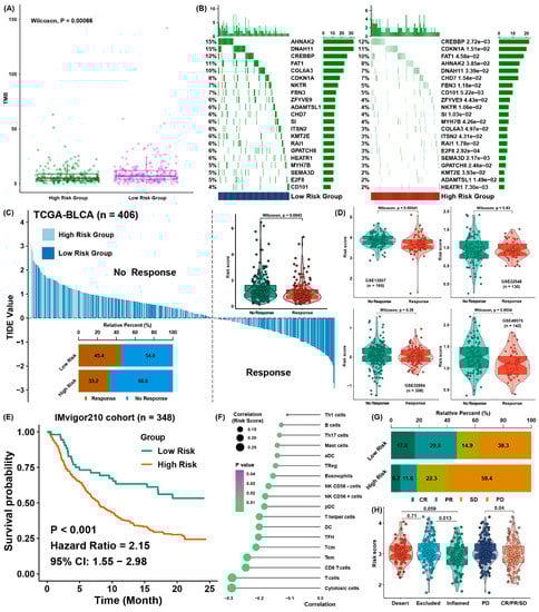 Evaluation efficacy for immunotherapy of the ferroptosis regulator signature. (A) The different levels of TMB between low-risk group and high-risk groups; (B) the mutation frequency of different risk scores groups; (C) the TIDE value of each sample with BLCA is presented based on distinct risk score groups, and the distribution of efficacy is shown on the bottom left. The levels of the risk score in different response groups is also presented; (D) the abundance of risk scores in groups with distinct response results in four external validation datasets is shown; (E) survival analysis of the risk score in the IMvigor210 cohort; (F) correlation analysis of the risk score and relative immune cell infiltration level in the IMvigor210 cohort; (G) relative percentages of CR, PR, SD and PD patients in different risk groups; (H) the abundance of risk scores in different groups in the IMvigor210 cohort.