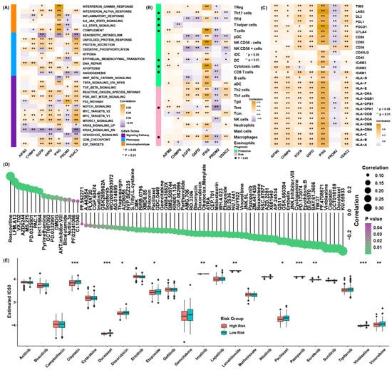 Potential therapeutic value of the ferroptosis regulator signature. (A) The correlation coefficients between the scores of the GSVA and the expression of members in the ferroptosis regulator signature in the TCGA cohort; (B) correlation analysis between the abundance of immune cell enrichment scores and the expression of members in the ferroptosis regulator signature in the TCGA cohort. The dots in the left columns represented the prognostic values of immune cell infiltration levels with statistic significances; (C) correlation analysis between the expression of MHC molecules, costimulatory factors, adhesion factors and the expression of members of the ferroptosis regulator signature in the TCGA cohort; (D) correlation analysis between the estimated IC50 value of 138 drugs in the GDSC cohort and the risk score in the TCGA cohort; (E) the estimated values of IC50 of some frequently adopted drugs for chemotherapy are presented in the distinct risk scores groups. * p< 0.05, ** p < 0.01, *** p < 0.001.