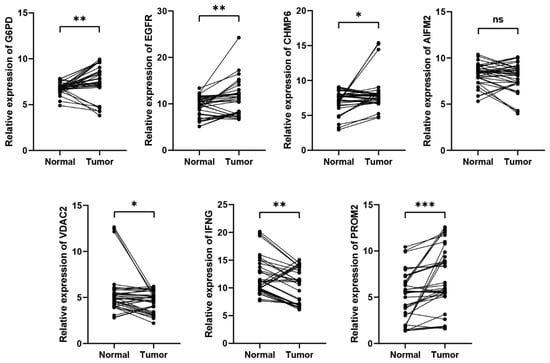 To better validate the results of bioinformatic analysis. We collected twelve paired normal bladder tissues and bladder cancer tissues (Figure 7). The results were presented in Figure 7. It demonstrated that the expression of G6PD, EGFR, CHMP6 and PROM2 were elevated in the tumor tissues. In addition, the expression of VDAC2 and IFNG were decreased in the tumor tissues. Moreover, there is no significant difference in the expression of AIFM2 between normal bladder tissues and bladder cancer tissues.