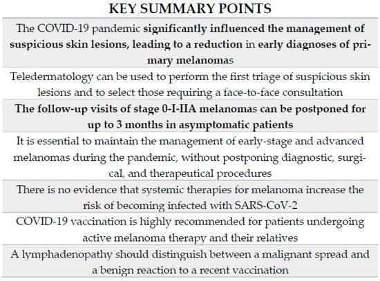 In this paper, we examine the main topics concerning the management of melanomas during this healthcare emergency, focusing on the importance of teledermatology, the diagnostic delay of melanomas, and how daily oncology practice has been impacted by the COVID-19 pandemic (Figure 1). We also report on the experience of our clinical center, which is situated in one of the most affected areas in Italy.