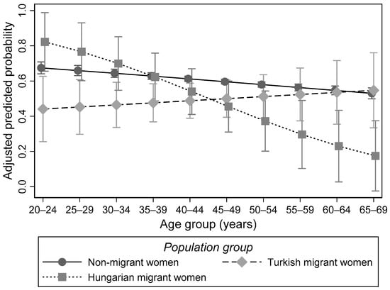 Probability of the utilization of cervical cancer screening by population group and age. Results of the multivariable logistic regression model with the utilization of cervical cancer screening in the last 3 years as the dependent variable and interaction effects between age and population group. Predicated probabilities (Austrian Health Interview Survey 2019; women aged 20–69 years; n = 6228).