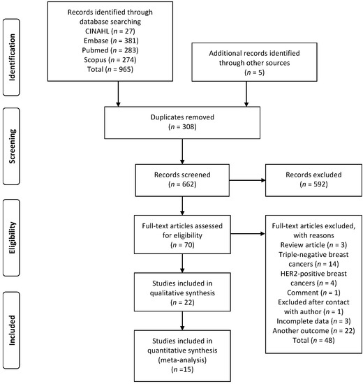 A total of 965 articles were identified through database searches, and five additional studies were identified through reference lists. After removing duplicates, 662 articles were selected for reading the titles and abstracts. The decisions of the first researcher (M.B.C.) and second researcher (C.R.M.) were compared, and a Cohen kappa statistic indicated high concordance between them (93.04%; adjusted kappa, 0.80) [19]. Seventy articles were selected for full-text reading. Of these, 22 articles met the eligibility criteria and were included in the systematic review, and 15 articles were included in the meta-analysis. The flowchart of the study selection process according to the PRISMA guidelines is shown in Figure 1.