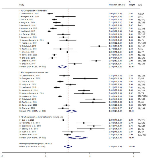 The overall proportion of PD-L1 expression in TCs, ICs, and TCICs was 26% (95% CI, 0.21–0.30) and was significantly higher in TCICs (37%, 30%, and 19% in TCICs, ICs, and TCs, respectively, p = 0.003) (Figure 2). There was significant heterogeneity between the studies (I2 = 97.50%, p < 0.001).