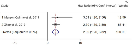 Two studies presented data on the association between PD-L1 upregulation and OS [28,40]. There was no heterogeneity among the studies (I2 = 0.0%, Cochran’s Q p = 0.681). PD-L1 expression was significantly associated with worse OS (HR: 2.39; 95% CI: 1.26–3.52, p < 0.001) (Figure 3).