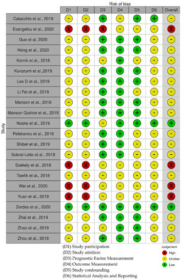 - Hayden, J.A.; van der Windt, D.A.; Cartwright, J.L.; Côté, P.; Bombardier, C. Assessing bias in studies of prognostic factors. Ann. Intern. Med. 2013, 158, 280–286. [Google Scholar] [CrossRef] [PubMed]