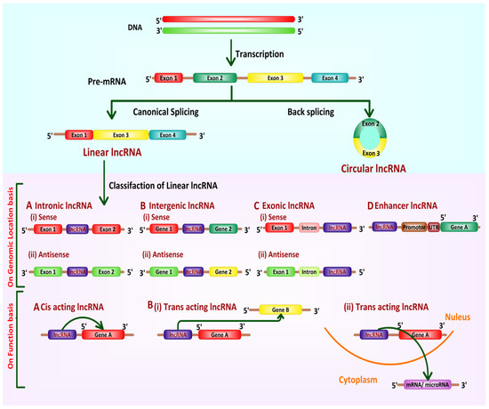 lncRNAs are often classified into two major categories, (A) linear lncRNAs and (B) circular lncRNAs (circRNAs), as mentioned in Figure 2 [49].