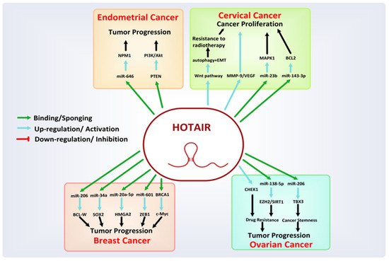 HOX transcript antisense intergenic RNA (HOTAIR) is a trans-acting lncRNAs located between HOXC11 and HOXC12 genes on chromosome 12q13.13, with 2158 nucleotides long and consisting of six exons [102]. Early studies exposed the HOTAIR as a significant regulator of the chromatin status and a facilitator of transcriptional silencing. It can recruit PRC2 (polycomb repressive complex 2) and causes transcriptional repression by trimethylation of histone H3 lysine 27 (H3K27) complex in the HOXD locus, while at the 3′ end it can interact with LSD (the lysine-specific histone demethylase) complex of LSD1/CoREST/REST which also leads to gene silencing [103]. HOTAIR suppresses the expression of various tumor suppressor genes. It is overexpressed in a variety of primary and metastatic cancers, including female-oriented cancers (as shown in Figure 4) and several other cancers, such as hepatocellular carcinoma, pancreatic cancer, prostate cancer, lungs carcinoma, colorectal cancer, vulvar cancer, and esophageal squamous cell carcinoma (ESCC) [104,105].
