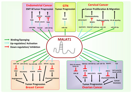- Liao, H.; Chen, Q.; Xiao, J. Reflections on the Role of Malat1 in Gynecological Cancer. Cancer Manag. Res. 2020, 12, 13489. [Google Scholar] [CrossRef] [PubMed]