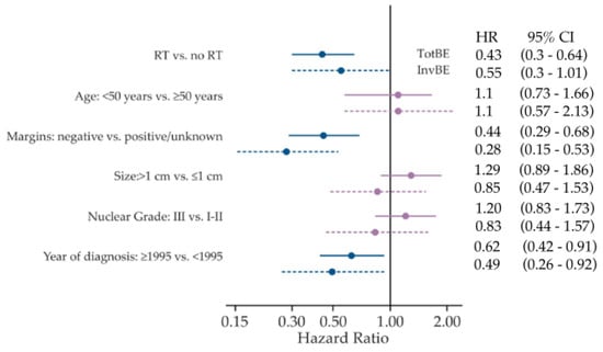 Figure 1. Multivariable analysis in SweDCIS, including patient and tumor characteristics. Hazard ratios with 95% confidence intervals for risk of all ipsilateral breast events (TotBE) and invasive events (InvBE) after 10 years, using the data set with complete biosignature data, including those with positive or unknown margins (n = 582).