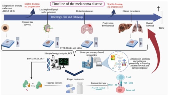 The overview of our study. Scheme illustrating the general working process of our study, showing the timeline of the melanoma disease, from the tumor diagnosis, through progression until the appearance of the distant metastases. This study included 90 FFPE melanoma samples collected during the oncology care and follow-up. The collected samples were submitted for histopathology and protein analysis by high-resolution mass spectrometry. Proteins and pathways were detected indicating survival and therapy response.