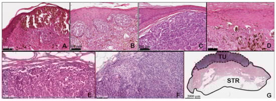 Histopathologic features of the representative cases in the study. Image captures, representing the spectrum of melanoma sample subtypes, including SSM (superficial spreading melanoma) (A), SSM with a vertical involvement (superficial spreading melanoma with vertical involvement) (B), NM (nodular melanoma) (C), ALM (acrolentiginous melanoma) (D), as well as both cutaneous (E) and lymphatic (F) metastases. Each sample also underwent a tumor (TU)/stroma (STR) ratio assessment (G) (HE (hematoxylin-eosin); OM (optimal magnitude) 112×).