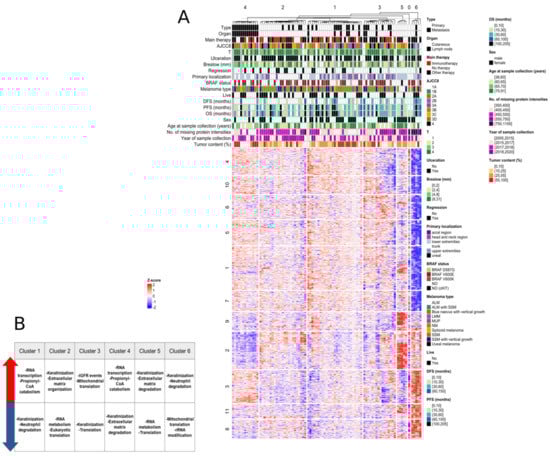 The protein expression patterns in the sample clusters. (A) The heatmap of the six detected sample clusters with the clinicopathologic data and the protein expression pattern (top 1000 most variable proteins, ANOVA FDR < 1.05 × 10−4). (B) The main biological functions linked to the sample clusters. DFS—disease free survival, PFS—progression-free survival and OS—overall survival. Clinical stage based on AJCC8. SSM—superficial spreading melanoma, LMM—lentigo maligna melanoma, NM—nodular melanoma, ALM—acrolentiginous melanoma.