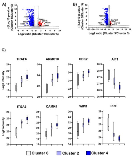 The bioinformatics analysis of the proteomic profiles captures two different sample clusters with distinct overall survival (i.e., cluster 1 and cluster 5). The comparison between cluster 1 vs. cluster 5 detected the downregulation of 316 protein groups (Figure 4A), mainly linked to the immune system (e.g., CD33, ARGI1, NKAP). In this case, the imbalances of these immune-related proteins were associated with poor clinical outcomes. For instance, the alteration in the abundance of proteins such as CD33, a transmembrane receptor expressed by myeloid lineage, was correlated with poor therapy responsiveness and disease progression [51,52]. On the other hand, the increase in ARGI1 in the tumors usually correlates with metastases and worse clinical prognosis [53]. Moreover, the expression of NKAP is negatively correlated with the levels of Notch target genes, which are essential for T-cell development [54]. Moreover, the NKAP acts as an oncogene and is connected with a poor outcome in cancer patients. It was demonstrated that NKAP knockdown suppresses the proliferation of HCT116 and HT-29 cells, inducing apoptosis [55,56]. On the other hand, 74 protein groups were found upregulated. Similarly, we detected the increase in proteins related to the immune system with anti-tumorigenic effects, such as GTPase IMAP family member 5 (GIMA5), described as a promoter of CD4+ T-cell survival and homeostasis [57,58]. GIMA5 also suppresses the proliferation of lung cancer cell lines [59]. In addition, we observed the increment of proteins such as mitogen-activated protein kinase 2 (MAP4K2), usually expressed in B cells of the germinal center and macrophages, which activates the c-Jun N-terminal kinases [60]. Similarly, we detected the different expression of PIK3CA between the sample clusters. This protein participates in several signal transduction pathways, such as the regulation of the T-cells, and cell signaling, but especially those that impact cell proliferation, survival, and apoptosis in tumors [61,62].