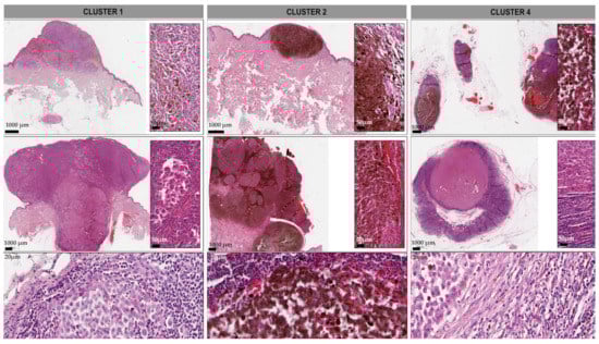 Histopathologic characteristics of the samples in sample cluster 1, 2 and 4. The image represents the spectrum of the morphology of the examined samples, as Cluster 1 involves vertical growth or de novo nodular melanomas displaying an anaplastic, fusiform or epithelioid phenotype (inserts). Additionally, a few metastases were also included exhibiting the same dedifferentiated morphology. In Cluster 2, similar phenotypes were noted, with a pronounced intratumoral melanin pigmentation. Cluster 4 entailed the majority of the lymph node metastases. OM (optimal magnitude) 112×; HE (hematoxylin-eosin) staining; inserts indicate magnified areas with scale bar 50 μm (Table S2).