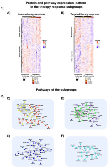 The heatmap of the treatment subgroups and the highlighted pathways. (1) Protein and pathway expression pattern in the therapy response subgroups. (A) Heatmap of the up- and downregulated proteins in patients with better and worse response in the immunotherapy subgroup. (B) Heatmap of the up- and downregulated proteins in patients with better and worse response in the targeted therapy subgroup. (2) Protein–protein interaction network of the up- and downregulated proteins in each treatment subgroup. (C) Proteins upregulated in patients with better outcome in the immunotherapy subgroup. The yellow color shows the extracellular matrix components, and red indicates the components from the immune system. (D) Proteins upregulated in patients with worse response in the immunotherapy subgroup. Proteins from the RNA processing are highlighted in green, whereas the purple color shows the members of the VEGFA-VEGFR2 pathway. (E) Proteins upregulated in patients with worse outcomes in the targeted therapy subgroup. The pathway analysis highlighted the key role of proteins involved in metabolic pathways. (F) Proteins upregulated in patients with better outcome in the targeted therapy subgroup. Multiple elements of RNA processing can be detected. The list of proteins involved in the aforementioned pathways is given in the Supplementary Document S1.