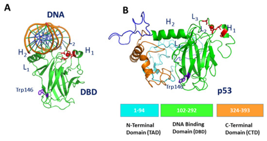 (A) Graphical representation of DBD complexed with DNA (as derived from chain B of 1TUP PDB entry [41]). (B) Graphical representation of the 3D model for the full-length monomer of p53 (see the text); at the bottom, the main domain structure is shown. In both views, Trp146 is marked in blue, while Zn and the residues forming the Zn-finger are marked in red.