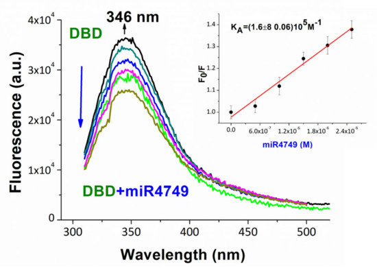 Fluorescence emission of DBD alone, shown in Figure 2 (black line), reveals a maximum at 346 nm, which is indicative that Trp146 is fully exposed to the solvent [73]. The addition of progressively higher concentrations of miR4749-5p to the DBD solution yields a decrease of the fluorescence intensity, without any shift of the maximum (see Figure 2, colored lines). The observation of the fluorescence quenching indicates the formation of a complex between miR4749-5p and DBD without the involvement of the Trp146 residue of DBD. To assess the specificity of the interaction, time-resolved emission fluorescence was applied. The measured average lifetime of DBD alone (2.79 ± 0.02) × 10−9s and of DBD in presence of miR4749-5p (1:1 ratio) × (2.82 ± 0.02) × 10−9s resulted to be almost the same, which clearly indicates the formation of a static complex between DBD and miR4749-5p [73]. On such a basis, the intensity of the florescence intensity was analyzed data in the framework of the Stern–Volmer equation, which predicts a linear dependence for the ratio F0/F (here F0 and F are the fluorescence emission intensity, detected at 346 nm, of DBD alone and in presence of miR4749, respectively) as a function of concentration of the quencher. The linearity of F0/F vs the concentration of miR4749-5p is shown in the Stern–Volmer plot shown in the inset of Figure 2. The corresponding slope provides an affinity constant, KA, of (1.68 ± 0.06)·105M−1 for our DBD/miR4749-5p-specific complex [73]. Such a value is consistent with those usually detected for complexes involving p53 [74,75].