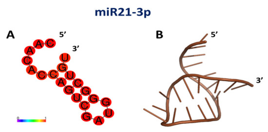To more strongly support such a hypothesis, and by taking advantage of the D-A distance, the same computational procedures developed to determinate the binding site between DBD and miR4749-5p, were here applied to the DBD and miR21-3p partners. Preliminary, the secondary structure of miR21-3p, not available, was derived by RNAFOLD [77]. The obtained model, shown in Figure 5A, is predicted with a high score, as witnessed by the presence of red spots throughout its sequence. Then, the tertiary structure was modeled by RNACOMPOSER software [78], the best models being shown in Figure 5B.