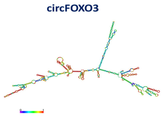 circFOXO3 (also named circ-0006404), derived from exon 2 of Forkhead box O3 (FOXO3), is an element of the FOXO family involved in the regulation of the cell cycle, energy metabolism and tumorigenesis [107]. circFOXO3 contains 1435 nucleotides. A model of the secondary structure of circFOXO3, obtained by RNAFOLD [77] and characterized by a minimum free energy of-498 kcal/mol, is shown in Figure 11. Similarly to what found for circCRD1as, the secondary structure exhibits a high complexity. The model exhibits a rather high prediction score (red color) throughout the whole structure. However, it is slightly different from that obtained by another algorithm (see ref. [81]); such a difference is not surprising due to the extension of the system that makes predictions rather difficult.