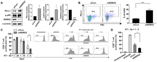 3.5. Knockdown of NDRG2 Expression in Tumor Cells Enhances the Expression Level of PD-L1, Leading to the Inhibition of T cell Proliferation by Tumor Cell Coculture