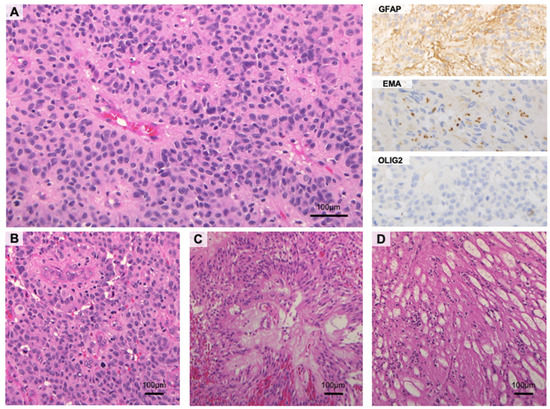 The traditional classification of ependymal tumors is based on histological criteria and includes: (i) classic ependymoma (EPN), (ii) anaplastic EPN, (iii) myxopapillary EPN, and (iv) subependymoma (SE) [4]. Classic EPNs are well-circumscribed neoplasms, characterized by uniform small cells with perivascular pseudorosettes or (more rarely) ependymal rosettes. Pseudorosettes are perivascular anuclear zones formed by tumor cell processes, whereas ependymal rosettes consist of tumor cells surrounding a central rounded or elongated lumen, reminiscent of ependymal canals (Figure 1). Specific architectural and/or cytological features identify three EPN variants, referred to as papillary, clear cell (i.e., oligodendrocyte-like), and tanycytic (i.e., spindle cell-shaped) EPN. Classic EPNs may feature highly cellular areas, dystrophic calcifications, and/or foci of ischemic necrosis. A high nuclear-to-cytoplasmic ratio, brisk mitotic activity, palisading necrosis, and/or microvascular proliferation are not features of classic EPN and prompt the histological diagnosis of anaplastic EPN [4]. On immunohistochemistry, both classic and anaplastic EPNs display dot-/ring-like cytoplasmic positivity for EMA, strong positivity for GFAP (mostly in pseudorosettes), and sparse OLIG2 expression (Figure 1). The Ki67 proliferation index varies from low (classic EPN) to moderate/high (anaplastic EPN).