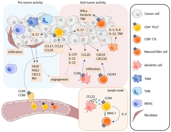 It has been reported that IL-17 enhances the expression of natural cytotoxicity receptors, perforin, TNF, and IFN-γ in NK cells and enhances the expression of IL-1, IL-6, IL-12, and TNF in macrophages [144,145,146]. In patients with ovarian cancer, IL-17 derived from Th17 cells has been shown to induce the production of CXCL9 and CXCL10 by tumor cells and tumor infiltrated macrophages, which recruits CXCR3-expressing CTLs and NK cells into tumor tissues [139]. Furthermore, Th17 cells have been shown to induce the production of CCL20 in tumor tissues, which recruits CCR6-expressing immature DCs to tumor tissues in a murine melanoma model. Consequently, tumor antigen-captured DCs migrate to draining lymph nodes and induce tumor-specific T cell responses [141]. While IL-17A promotes angiogenesis by increasing the production of VEGF, other Th17 cell derived cytokines such as IL-17F, IL-21, and IL-22 have been shown to have anti-angiogenic activities [147,148,149]. It has also been reported that IL-17 activates the caspase-dependent apoptosis signal in a breast cancer cell line [150].