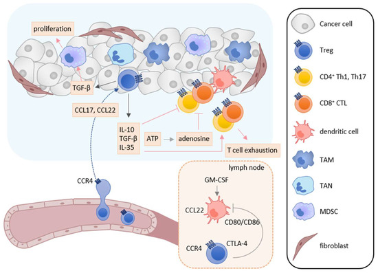 Roles of Treg cells in tumor immunity. In the tumor microenvironment, TAMs, TANs, tumor cells, and cancer-associated fibroblasts secrete CCL17 and/or CCL22, and recruit CCR4-expressing Treg cells into tumor tissues. Infiltrated Treg cells secret immunosuppressive cytokines such as IL-10, TGF-β, and IL-35. These cytokines suppress the activation and induction of tumor-specific T cell responses and induce T cell exhaustion. TGF-β also enhances the differentiation and immunosuppressive function of MDSCs. Furthermore, adenosine is generated from ATP derived from apoptotic Treg cells and inhibits the function and proliferation of effector T cells. Treg cells also inhibit the costimulatory signals of DCs to induce tumor-specific T cell responses by the CTLA-4-CD80/CD86 interaction.