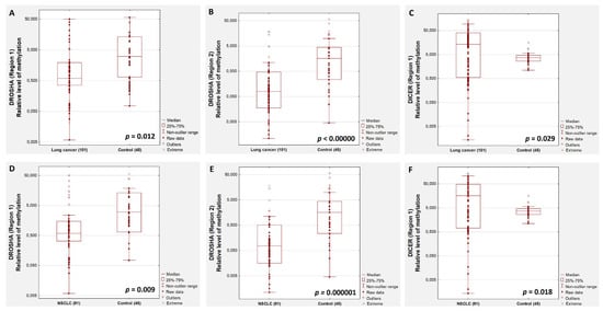 We evaluated the methylation status of four promoter regions: two for the DROSHA gene and two for the DICER gene. We observed a significant difference in the relative level of DROSHA gene methylation in both regions between the control group and lung cancer patients (Figure 1). There was a significantly lower relative methylation level of DROSHA gene in the whole group of lung cancer patients (p = 0.012 for the first region, Figure 1A, and p < 0.00001 for the second region, Figure 1B) and in NSCLC patients (p = 0.009 for the first region, Figure 1D, and p = 0.00001 for the second region, Figure 1E) compared to healthy individuals. We observed a significantly higher relative methylation level in the first region of the DICER promoter in lung cancer patients (p = 0.029, Figure 1C) and in NSCLC patients (p = 0.018, Figure 1F) compared to healthy people (Figure 1). However, we did not observe such differences in the methylation level of the second examined region of the DICER promoter in these groups of patients.