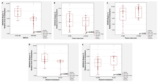 Furthermore, we showed that the relative methylation level of the first region of the DROSHA gene was significantly (p = 0.037) higher in patients with early stage NSCLC (IA-IIIA) compared to those with locally advanced (IIIB) or metastatic (IV) NSCLC (Figure 2A). We found a significantly (p = 0.01) higher relative methylation level of the first examined region of the DICER gene in patients with larger tumours (Figure 2C). An insignificantly higher (tendency to significance, p = 0.053) relative methylation level of DROSHA (region 2) was found in patients with larger tumours (Figure 2B). An insignificantly higher methylation level of regions 1 (Figure 2D) and 2 (Figure 2E) of DROSHA was observed in patients with or without distant metastases, respectively (p = 0.081 and p = 0.088, respectively).