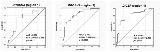 In further analysis, we assessed the usefulness of the methylation test in distinguishing between patients in the early stages of NSCLC and healthy individuals (Figure 3). We noticed that the relative level of methylation of the first analysed region of the DROSHA gene could discriminate these group of patients from healthy people with 71% sensitivity and 76% specificity (AUC = 0.696, 95% Confidence Interval (CI): 0.545–0.847, p = 0.011). Values of these parameters in the methylation analysis of the second region of the DROSHA gene were as follows: 60% sensitivity and 85% specificity (AUC = 0.795, 95% CI: 0.689–0.901, p < 0.0001). Methylation analysis of the first region of the DICER gene revealed 96% sensitivity and 60% specificity (AUC = 0.651, 95% CI: 0.517–0.785, p = 0.027).