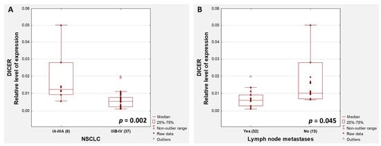 We found no statistically significant correlation (or even a trend) between the level of methylation and the expression of DROSHA and DICER genes (p > 0.1). Similarly, we found no correlation between the DROSHA and DICER gene expression and demographic and clinical variables. The only exceptions were a significantly higher level of DICER expression in patients with early stages (IA–IIIA) compared to those in advanced stages (IIIB–IV) (p = 0.002, Figure 4A), and in patients without lymph node metastases (p = 0.045, Figure 4B) compared to those with metastatic lymph nodes.