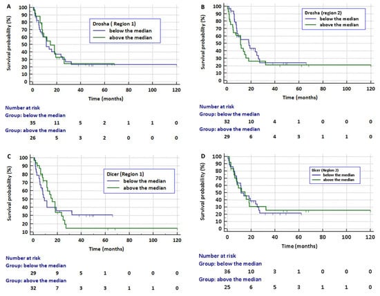Overall survival (OS) data were available in 61 (60.4%) patients, including 32 with AC (52.4%), 24 with SqSC (39.3%), and 4 with NOS NSCLC (6.6%). The median OS was 13.6 mth (95%CI: 8.3–19.1 mth). There were no significant differences in the median OS in the analysed subgroups, depending on the relative level of methylation of DROSHA and DICER. For DROSHA region 1, the median OS was insignificantly higher (14.6 mth vs. 11.3 mth) if the methylation level was above the median (HR = 0.909, 95% CI: 0.477 to 1.732, p = 0.771, Figure 5A). For DOSHA region 2, the OS was insignificantly higher (18.3 mth vs. 11.3 mth) if the methylation level was below the median (HR = 0.731, 95% CI: 0.386 to 1.384, p = 0.336, Figure 5B). For DICER region 1, the median OS was insignificantly higher (15.7 mth vs. 9.1 mth) if the median level of methylation was above the median (HR = 0.989, 95% CI: 0.522–1.871, p = 0.972, Figure 5C). For DICER region 2, the median OS was insignificantly higher (14.6 mth vs. 11.3 mth) if the median level of methylation was above the median (HR = 0.976, 95% CI: 0.5140 to 1.8519, p = 0.940, Figure 5D).