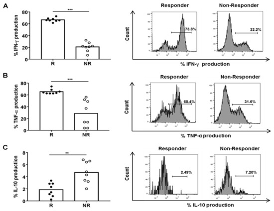 We found a positive correlation between the production of IFN-γ, but not of IL-10 and TNF-α, in CD8+ HLA-DR+ T cells after culturing PBMCs in the presence of plasma from R or NR patients and the percentage of CD8+ HLA-DR+ T cells in peripheral blood of all patients (Supplementary Figure S3A–C). However, the production of these cytokines was not statistically different in CD8+ HLA-DR− T cells in the same PBMC culture conditions (Figure S4A–C).