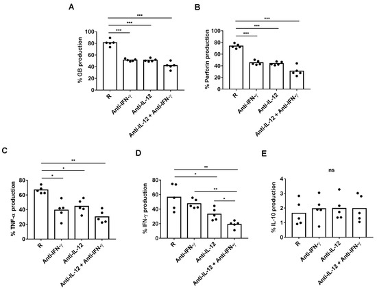 Regulation of cytotoxic granules and intracellular production of cytokines by neutralizing 0.5 ug/mL of anti-IFN-γ (n = 5) and/or 10 ug/mL of anti-IL-12 (n = 5) antibodies in a 72 h-culture of HD PBMCs with 25% plasma from R patients. Percentages of CD8+ HLA-DR+ T cells producing intracellular (A) granzyme B, (B) perforin, (C) IFN-γ (D) TNF-α (E) and IL-10 determined by ELISA. * p < 0.05; *** p < 0.001.