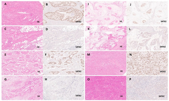 - Dragomir, A.; de Wit, M.; Johansson, C.; Uhlen, M.; Ponten, F. The role of satb2 as a diagnostic marker for tumors of colorectal origin: Results of a pathology-based clinical prospective study. Am. J. Clin. Pathol. 2014, 141, 630–638. [Google Scholar] [CrossRef] [Green Version]