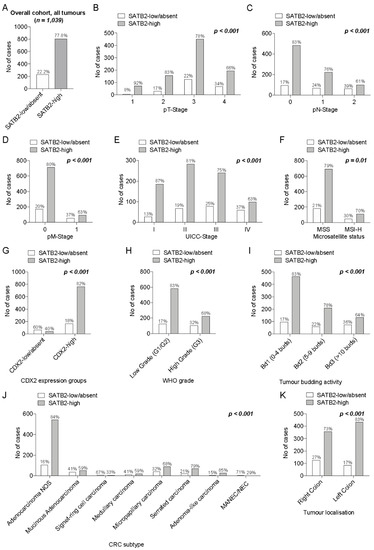 (A–D): Prevalence of SATB2 expression groups within the overall cohort (A) and in pT (B), pN (C), pM (D) and combined UICC stage subgroups (E). (F,G): Distribution of SATB2 expression groups among MSS vs. MSI-H (F) and CDX2-low/absent vs. CDX2-high CRCs (G). (H–K): Differential distribution of SATB2 within WHO low-grade vs. WHO high-grade CRCs (H), among the different tumour budding subgroups (Bd1, Bd2, Bd3; (I)), among colorectal cancer subtypes (J) and in right- vs. left-sided CRCs (K).