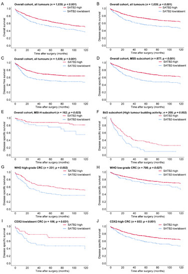 Prognostic relevance of SATB2 expression in univariate analyses on overall-, disease specific- and disease free-survival in the overall cohort (A–C) and for disease-specific survival in specific CRC subgroups: MSS (D) and MSI-H (E) subcohorts, high tumour budding activity subcohort (F), WHO high-grade (G)/WHO low-grade (H) subcohorts, CDX2-low/absent (I)/CDX2-high (J) subcohorts.