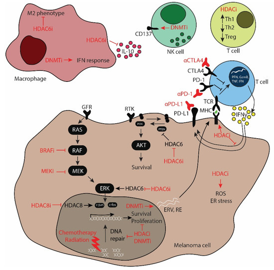 Modulatory effects of epigenetic modifiers in cellular (intrinsic) and immunological (extrinsic) processes. The modulatory effects of HDAC and DNMT inhibitors (HDACi and DNMTi, respectively) in extrinsic factors include the regulation of Th1, Th2, and Treg functions, NK (natural killer) cell activation through CD137, the protumoral M2 macrophage phenotype, secretion of anti-inflammatory cytokines such as interleukin-10 (IL-10), and the stimulation of the interferon (IFN) response. Epigenetic drugs modulate key cellular pathways in melanoma cells. The MAPK pathway activated by GFR (growth factor receptor) signaling activates RAS, RAF, MEK, ERK, c-jun, and c-fos, which regulate the expression of survival and proliferation genes. Similarly, the PI3K/AKT pathway activated by RTKs (receptor tyrosine kinases) leads to the activation of PI3K (PI3 kinase), which then activates AKT and promotes survival. HDACi and DNMTi also modulate the immunogenicity of melanoma cells via increasing antigen presentation in MHC (major histocompatibility complex) and increasing the expression of ERVs (endogenous retroviruses) and RE (repetitive elements), which activates the T cells. Upon activation through TCR (T cell receptor) signaling, T cells release TNF (tumor necrosis factor), GzmB (granzyme B), PFN (perforin), and IFN. HDACi regulate the expression of immunosuppressive genes such as PD-L1 (programmed cell death ligand 1), which can be blocked using anti-PD-1 (programmed cell death 1) antibodies. HDACi generate ROS (reactive oxygen species) and induce ER (endoplasmic reticulum) stress. Additionally, HDACi and DNMTi synergize with radiation therapy and chemotherapy via inhibition of the DNA repair machinery, eventually leading to cell death.