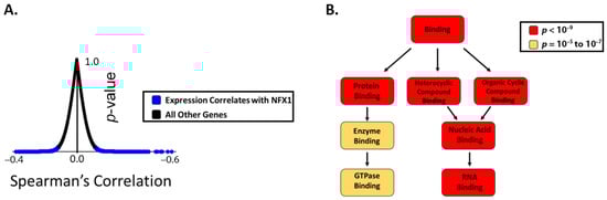 Previous publications have demonstrated that elevated expression of NFX1 correlated with changes in the expression of other genes, especially in the context of cells that are expressing 16E6 [23,25]. To identify genes whose expression correlated with NFX1 in cervical cancers, we ranked genes based on the extent to which their expression significantly correlated with NFX1 expression in the Cancer Genome Atlas (TCGA) cervical cancer data set (Supplemental Table S2). This ranking was based on their q-values derived from Benjamini–Hochberg false discover rate correction procedure. There were 13.2% (2656 of 20069) of the genes in the TCGA dataset that had a q-value less than 0.05, indicating statistically significant correlation with NFX1 expression (Figure 1A). We then used the Gene Ontology enRIchment anaLysis and visuaLizAtion (GOrilla) tool to identify enrichments among the functions of these genes. Gene ontology analysis by GOrilla identified a significant enrichment in genes involved in protein binding and RNA binding (Figure 1B). These data are consistent with known functions of NFX1 [14,17,21]. These data support that, in the context of cervical cancer, NFX1 expression correlates with other genes and pathways involved in RNA biology and, by extension, may directly or indirectly regulate RNA expression and protein amounts of genes important in cervical cancer.