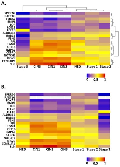 Unsupervised cluster analysis was applied to these genes with respect to disease state and gene expression. For disease state, there were three distinct clusters (Figure 2A, disease state clustering, top). Premalignant lesions formed one cluster. Cervical tissue with NED, Stage 1, and Stage 2 cancer formed a second cluster. Stage 3 cervical cancer formed its own cluster, distinct from the other two. Thus, many of the substantial changes in gene expression were seen between NED and premalignant tissues as well as different stages of cervical cancer. Unsupervised clustering by gene expression found two distinct clusters among the NFX1-responsive genes (Figure 2A, gene expression clustering, right). Approximately one third (7 of 19; SPRR2G, RAET1G, FOXA2, BNIPL, LOR, LCE2B, and LCE1B) had expression that was highest among the NED/Stage1/Stage2 cluster, lower in the premalignant cluster, and even lower in Stage 3 cervical cancer tissue. The larger cluster (9 of 19; PPL, TGM1, KRT16, IMPA2, CEBPD, NOTCH1, RPS29, CCNB1IP1, SLPI) had the highest expression in premalignant tissue and lowest in Stage 3 cervical cancer tissue. A final smaller group of three genes (ALDH3B2, RAB7B, and FBN2) had an expression pattern like the larger cluster, but without the notably increased expression in premalignant tissue. These analyses show the dynamic differences in 16E6/NFX1-123 co-regulated genes at different stages of cervical cancer progression (Figure 2B).