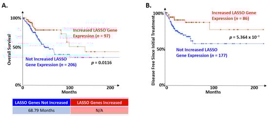 Alternatively, these changes may be a result of patient physiological responses to combat the infection or the developing dysplasia. This might be suggested given the Kaplan–Meier survival curve data. These data show that despite their correlation with disease progression, increased expression of LASSO-identified genes (excluding FBN2, which led to a decrease in survival) led to improved survival (Figure 3). It may be that upregulation of these genes signifies the body’s corrective response to oncogenesis rather than dysregulation directly caused by the cancer. Still another possibility might be that high expression of these genes sensitizes the cancer for treatment even while encouraging its development, something that is implied by the disease-free since initial treatment survival curve. The reason for these findings also warrants further study.