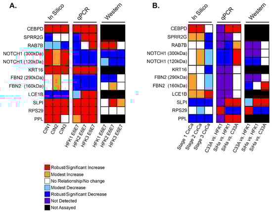 Summary of in silico and in vitro analyses of LASSO-identified genes. Expression and abundance of LASSO-identified genes/gene products is summarized. (A) Transcriptomic data of premalignant lesions and qPCR and immunoblot data of E6E7-expressing HFKs. (B) Transcriptomic data of cervical cancers and qPCR and immunoblot data in cervical cancer cells. For all, in silico data is shown with disease state increasing from left to right (i.e., The first column of in silico data is CIN1/Stage1 and the last is CIN3/Stage 3). qPCR and immunoblot data in (A) are shown as comparisons between parent HFK and HFK transduced with E6E7 for each biological background. qPCR and immunoblot data in (B) compare C33A to parent HFK1, SiHa to parent HFK1, and SiHa to C33A. For NOTCH1 and FBN2, two bands were detected by immunoblot. Information for both bands is shown and indicated in kDa sizes.
