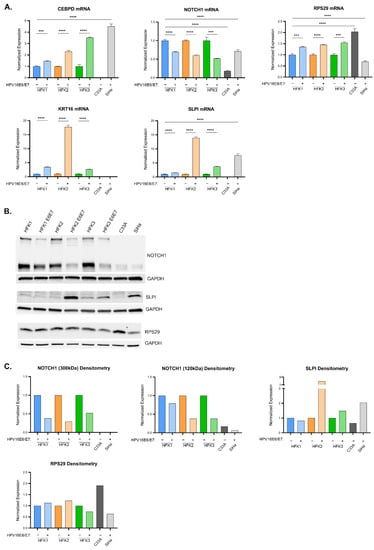 At the protein level, 16E6E7 expression in HFKs yielded less reliable, less conclusive changes in gene expression than seen at the mRNA level. NOTCH1 decreased consistently at the protein level in response to 16E6E7 expression in HFKs, as it did at the mRNA level. SLPI, however, was somewhat difficult to detect in HFKs whereas there was robust overexpression at the mRNA level. RPS29 showed modest alterations at the protein level as well. These observations are generally true for the cancer cells as well. As the qPCR data gave more clearly quantifiable results, and because the in silico data utilized transcript data only, this work suggests the study and biomarker potential of these genes in response to HPV-mediated dysregulation is more useful at the mRNA level.