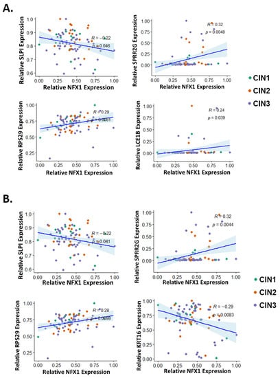 Correlation of LASSO-identified genes with NFX1 expression in premalignant cervical lesions. The expression of each LASSO-identified genes was plotted (y-axis) against the expression of NFX1 (x-axis) in premalignant cervical lesions. LASSO-identified genes whose expression has significantly correlated with NFX1 as determined by (A) Spearman correlation analysis or (B) Pearson correlation analysis is shown. For all, R and p-values are shown. CIN1 = cervical intraepithelial neoplasia grade 1 (green), CIN2 = cervical intraepithelial neoplasia grade 2 (orange), and CIN3 = cervical intraepithelial neoplasia grade 3 (purple).