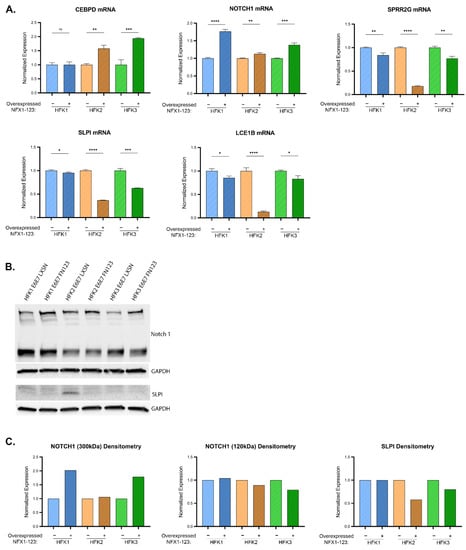 The HPV16 oncogenes E6 and E7 are two of eight protein-coding genes in the viral genome; these proteins are required for cellular transformation as they prevent apoptosis and senescence through degradation of p53 and Rb [13], as well as disrupt many other regulatory pathways [14,15]. Our lab and others have shown that HPV16 E6 (16E6) binds to the host cell protein NFX1 [16,17], of which there are two isoforms: NFX1-91 and NFX1-123 [16]. The longer splice variant, NFX1-123, is highly expressed in cervical cancers and cell lines [18,19,20] and is upregulated in HPV+ compared to HPV- head and neck primary tumors [21]. It has also been shown that the protein partnership between 16E6 and NFX1-123 dysregulates genes involved in cellular growth, longevity, differentiation, and immune signaling [17,19,22,23,24,25]. A genome-wide microarray identified multiple genes upregulated by NFX1-123 in 16E6-expressing human foreskin keratinocytes (HFKs) including CEBPD, SLPI, LOR, and KRT16 [23]. Overexpression of NFX1-123 in addition to co-expression of 16E6 also led to an increase in hTERT mRNA abundance and telomerase activity [17,20,22]. Concurrently, these cells exhibited an upregulation in the expression of NOTCH1, a master cell fate regulator, as well as its canonical and non-canonical downstream targets involved in differentiation such as HES1, HES5, KRT1, and KRT10 [19,23,25]. Recently, we have shown, like NFX1-123 itself, that the expression level of many of these genes were also high in HPV16-positive primary cervical cancers relative to normal cervical tissues [18].
